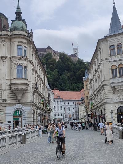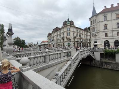 リュブリアナ旧市街と新市街の境にかかる橋です。なぜか三本並列にかかっています。聞くところによると、まず真ん中の橋がかけられて、そのあと、歩行者用として両側の二本がかけられたとか。真偽のほどはわかりませんが、それで名物の観光地となっているのだから、結果オーライとしましょう。