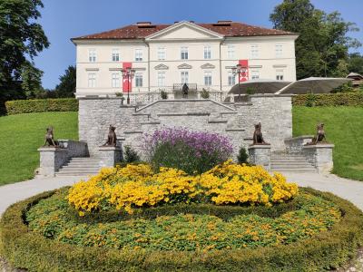 リュブリアナ駅からブラブラ歩いて30分ほどでティヴォリ公園に着きます。緑が多い公園の中を散策していると、きれいな花壇の向こうにティヴォリ城が見えました。それほど大きな建物ではありませんが、こじんまりした宮殿といった感じがします。