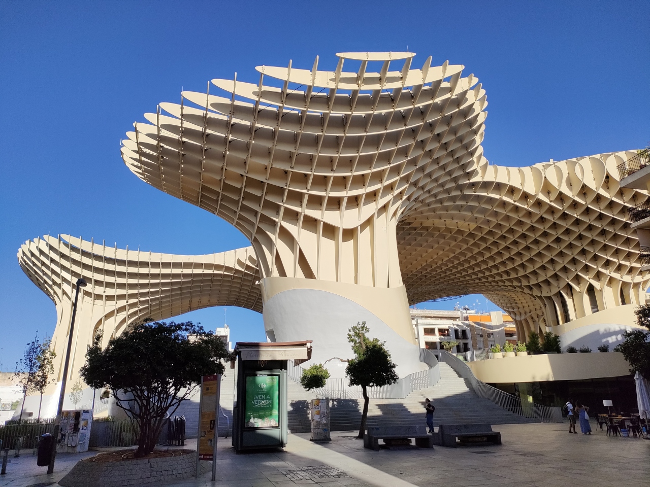 町中に突然現れるこのパラソル。まず見た人はびっくりすると思います。写真で事前に見てから行きましたが、想像以上に大きくて驚きました。しかも存在する場所が町中のにぎやかなところ、どうやって作ったのかなと建設したときの状況に思いを馳せたりしました。