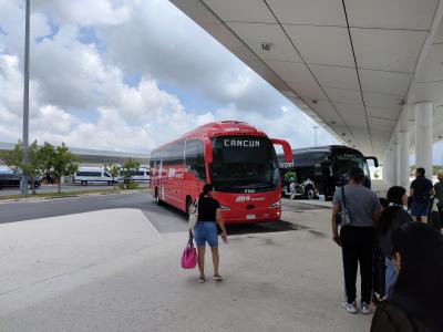 ダラス・フォートワース空港からカンクン空港まで約3時間のフライトでした。空港に降り立つと南国のリゾート気分満開のような雰囲気です。灼熱の太陽と大勢の人々が出迎えてくれます。多くの人はリゾートホテルの送迎バスで目的のホテルに向かいます。一般のバスは空港を出て右側に行けばADOの真っ赤なバスがカンクン市内まで連れて行ってくれます。120メキシコペソでした。