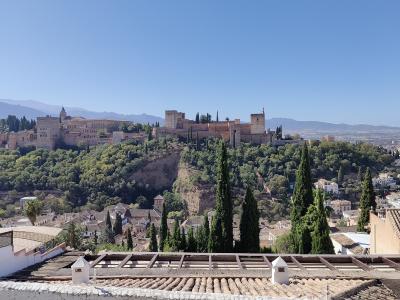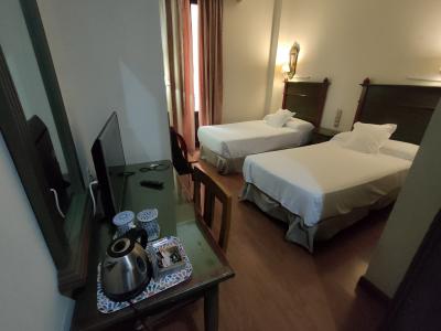 グラナダ駅からバスに乗って10分程度、ヌエバ広場にほど近いバス停で下車すれば歩いて5分ほどでホテルに着きます。ホテルからグラナダのメインスポットであるアルハンブラ宮殿には歩いて行けます。入り口が少しわかりづらい、ヌエバ広場側ではなく横の路地に面したところに入り口があります。部屋はやや古いですが、清掃も行き届いているので問題はありません。