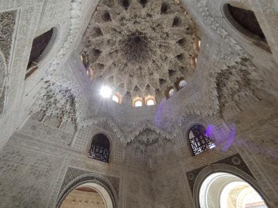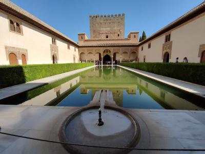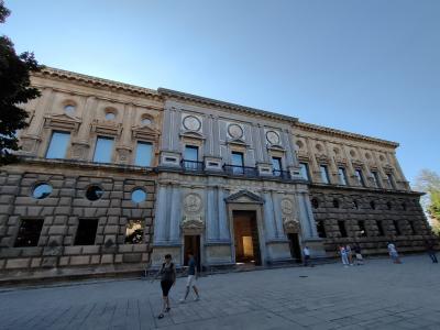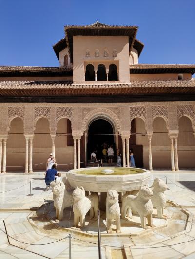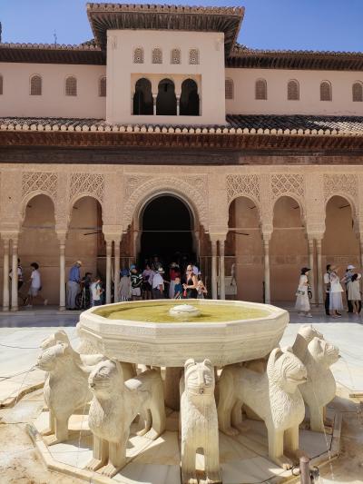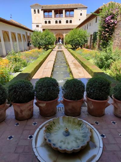 グラナダの代表的な観光地、言わずと知れたアルハンブラ宮殿。混雑がハンパないと聞き、WEBで入場券は手配しました。ヌエバ広場から歩くこと約20分、宮殿の入り口に到着。指定の入場時間を待つ間にアルカサバやカルロス5世宮殿を見学しました。指定の時間に行ったところ、すでに長蛇の列、時間指定でも入場するのはたいへんです。しかし中に入ってしまえばそんな苦労はすべて忘れてしまう、それくらい素晴らしい!あらためてイスラム文化の華麗さに酔いしれました。