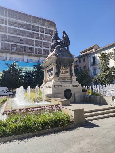 広場のまわりにはショップやレストランが多数あり、グラナダの中心的な広場ということができると思います。広場の真ん中にはイサベル女王とコロンブスの像が立っており、そのまわりを噴水が取り囲んでいます。非常に目立つ存在なので道に迷ったときにここさえわかれば便利かと思います。
