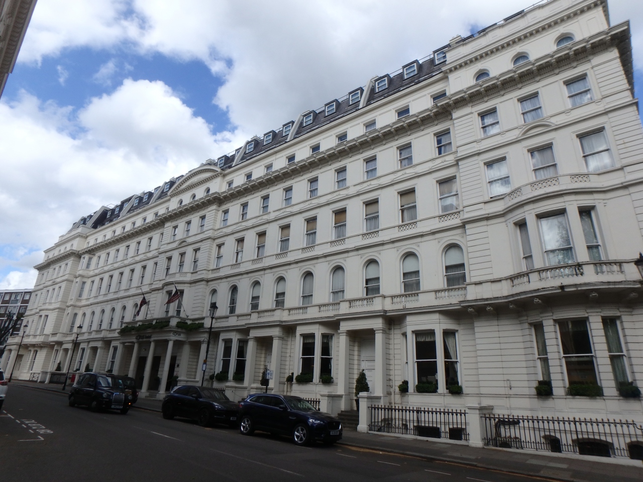 ハイドパークの北側、道路をはさんだ目の前にあります。ルートン空港からバスを利用しましたが、バスストップがやや離れた場所になるので(パディントン駅の北側、高架橋の上)少々歩きます。ホテル自体はかなり年季の入ったホテルでレセプションのあたりはきれいにしてありますが、部屋は古びた印象でした。外観は立派な建物です。