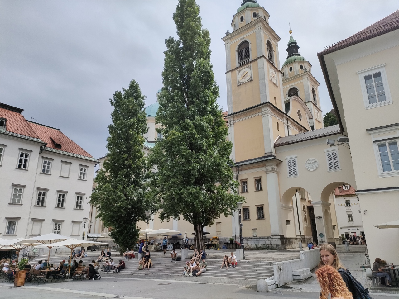 リュブリアナ旧市街と新市街の境にかかる橋です。なぜか三本並列にかかっています。聞くところによると、まず真ん中の橋がかけられて、そのあと、歩行者用として両側の二本がかけられたとか。真偽のほどはわかりませんが、それで名物の観光地となっているのだから、結果オーライとしましょう。