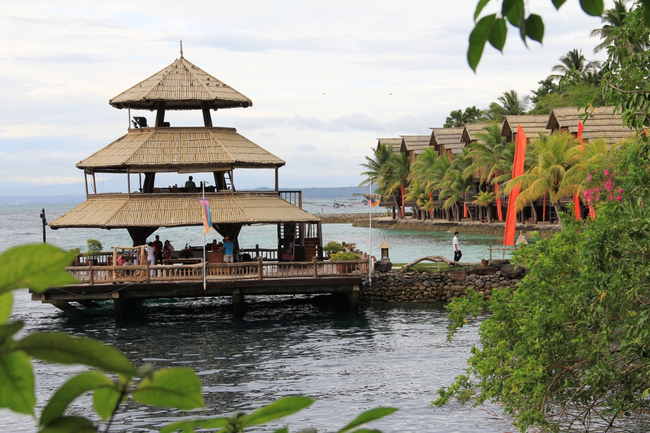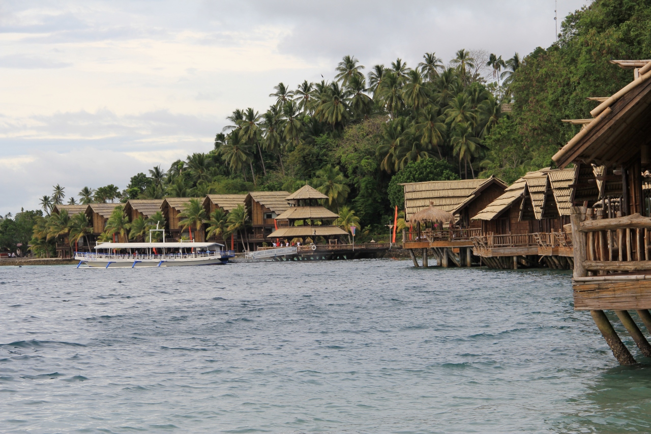 ダバオ国際空港から専用のバンで空港近くの港へ、そこにあるホテルの桟橋が専用船の発着場です。船が出るまでそのホテルで昼食。そしていよいよサマール島へ出発です。所要時間は1時間余り、到着したらコテージにチェックイン、海の上に建っていますから魚が泳いでいるのが見えます。レストランが1ヶ所しかないのが少し残念です。