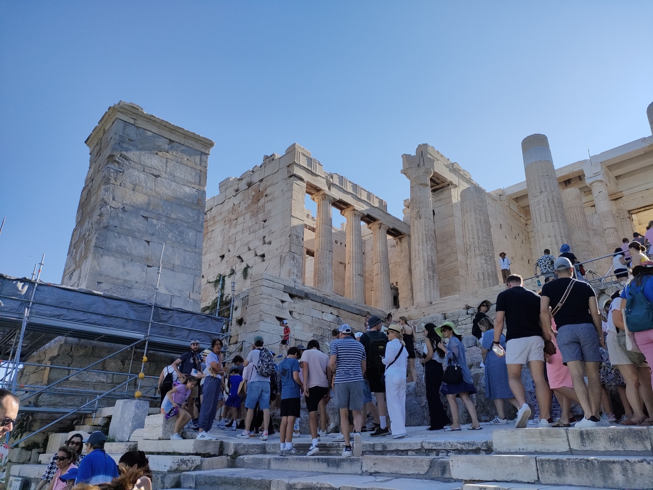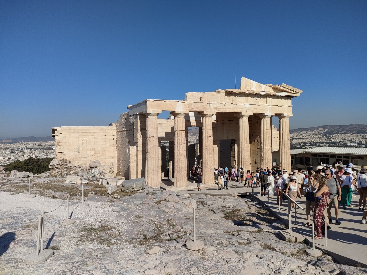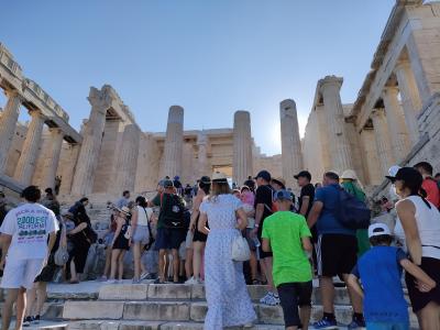 アクロポリスの丘の入場ゲートを入り、最初に見えてくる建物がこの前門とよばれるプロピレアです。階段を登っていくと柱の列が見えてきます。そこを過ぎるとゲートのようになっていて、まさに前門のような雰囲気です。このあたりは通路が狭いので人が多い時には渋滞が発生します。