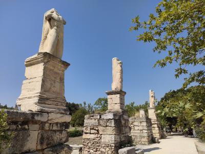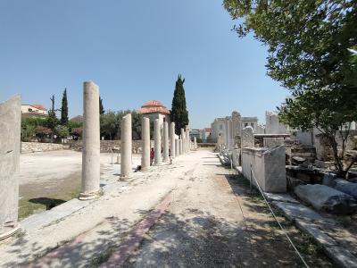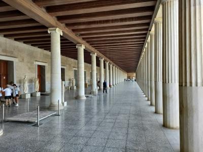 古代アゴラ遺跡を見学していると最後にこの建物に行き当たりました。2階建ての建物で両端に階段があり、上にあがることができます。その1階部分が柱廊とよばれる柱の列を再現したものです。1,2階ともに展示物がありますが、やはり見どころはこの柱の列ではないでしょうか。