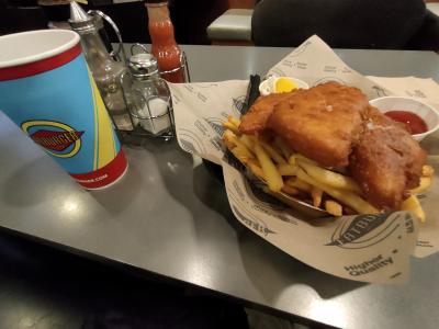 有名なハンバーガーのチェーン店です。店は清潔な感じで、ランチ時には結構込み合っていました。今回は少し変わったものが食べたくて、フィッシュ・アンド・チップに挑戦しました。料金は16ドル。結構ボリュームがあり、おなかいっぱいになりました。美味しかったです。