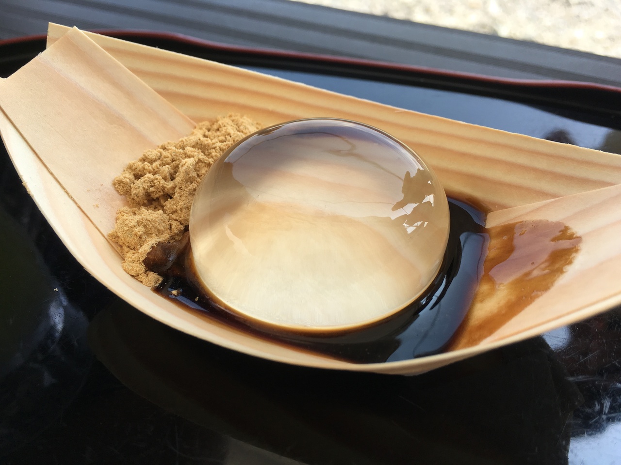 土日限定、期間限定の水信玄餅めあてで行きました。9時オープンのお店で7時半頃に到着しました。駐車場には入れましたがすでに長い列。100人弱ってところかなぁ?8時過ぎの人は場内の駐車場もいっぱいの様子でした。オープンしたらお金を払い整理券をもらって待ちます。34番の番号札でした。会計後は少し待つ程度です。建物横にテントと椅子があり、そこでいただきます。時間が経つと水が出てきてしまい、車の振動にも弱いみたいで現地での提供のみです。