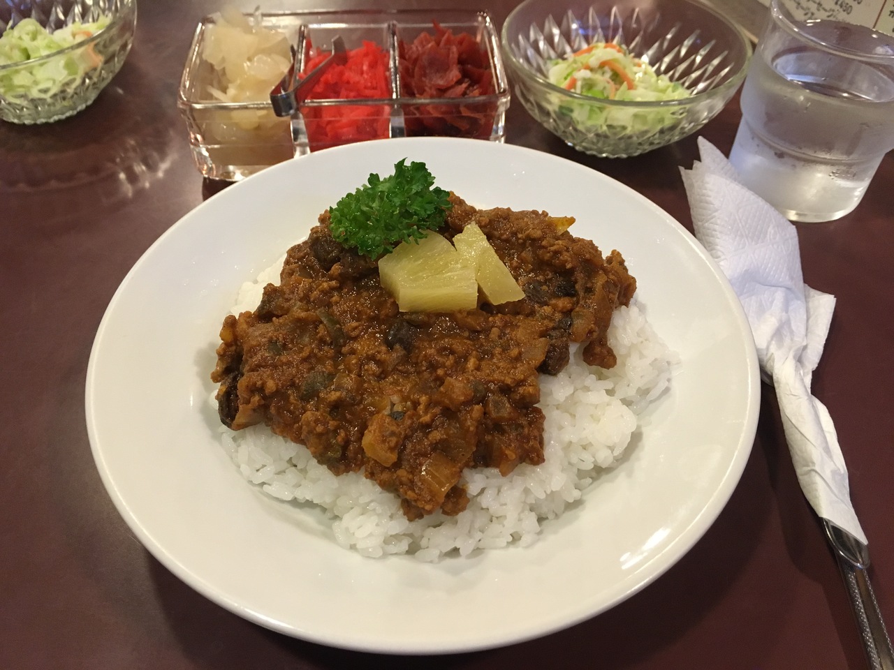 ドライカレーを食べてみました。メニューにはゆで卵のスライスで写真が載っていたのにパイナップルだったのがちょっと残念でした。ドライカレーの中にもレーズンが入っていてフルーツ入りが苦手じゃなければ美味しいと思います