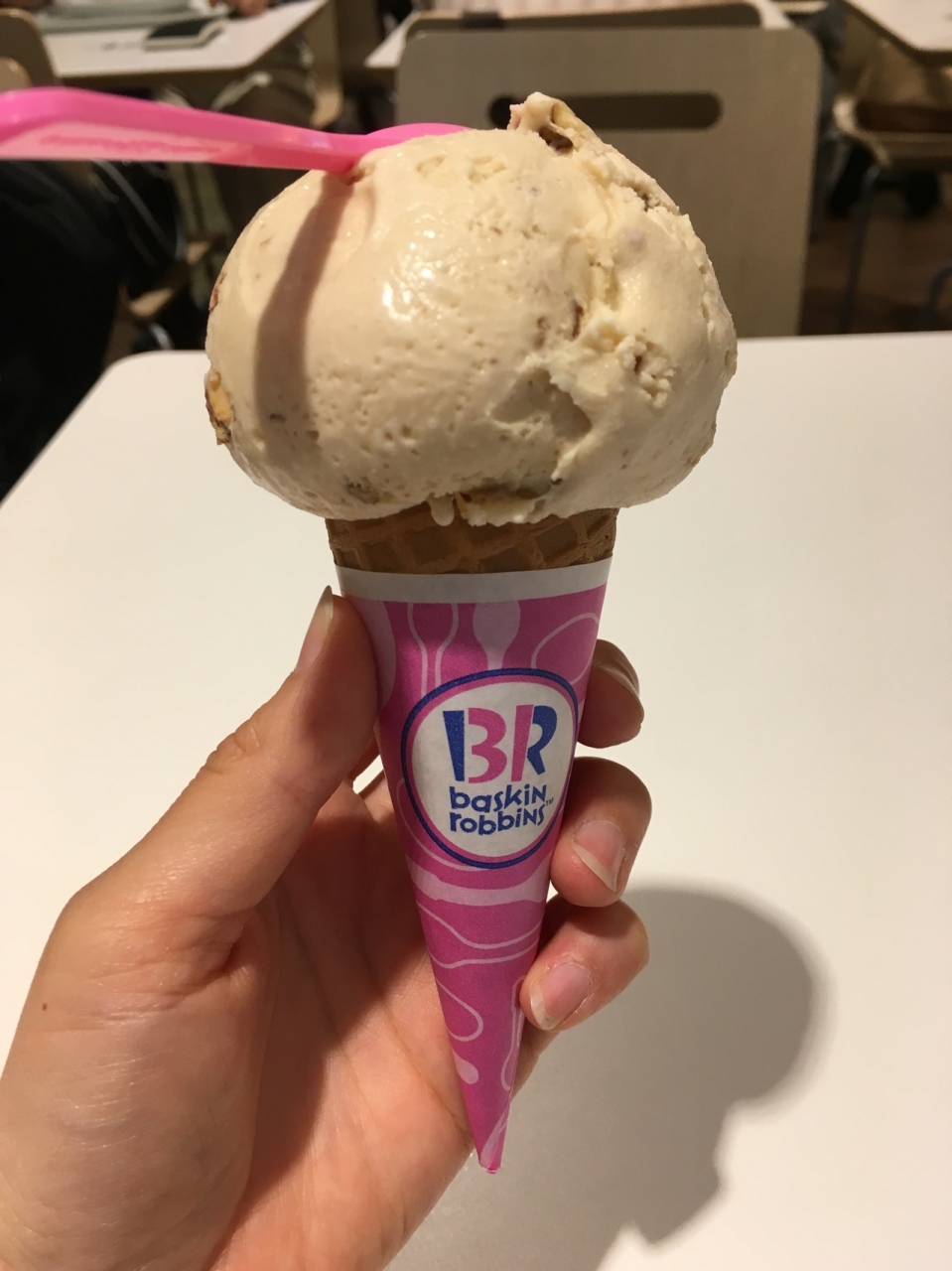上大岡駅の京急にあるショッピングモール内のサーティワンです。5月9日はアイスの日でシングルコーンが100円でした。13時から15時までと時間が決まっていましたがちょうど昼休みだったので行きました。13時前に着いたら列になっていてもう販売してくれてました。並びながら味を選んで流れも早かったのでそれほど待たずに購入できました。アイスの日、はじめて知ったのですがお得でした。