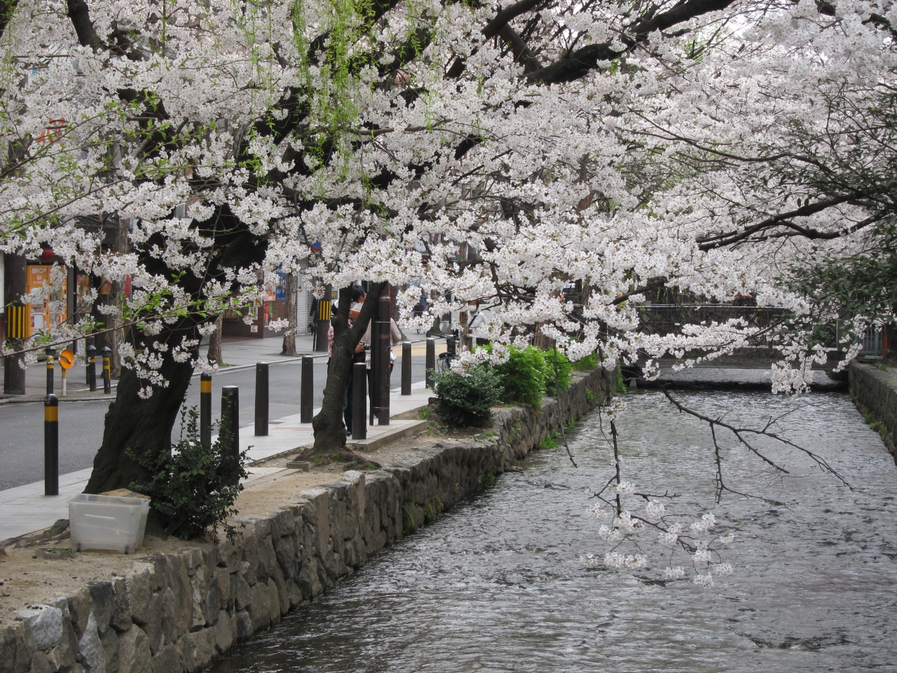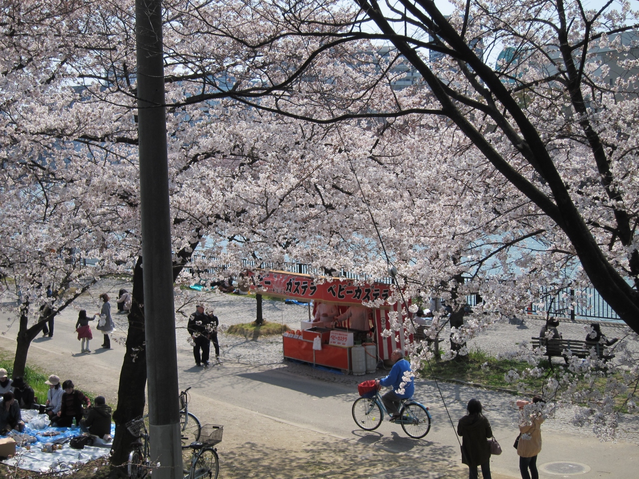 川沿いに咲く桜は見事で、沿道にブルーシートなどを敷いて、お花見をするグループでいっぱいです。露店も並んでます。- 旅行時期