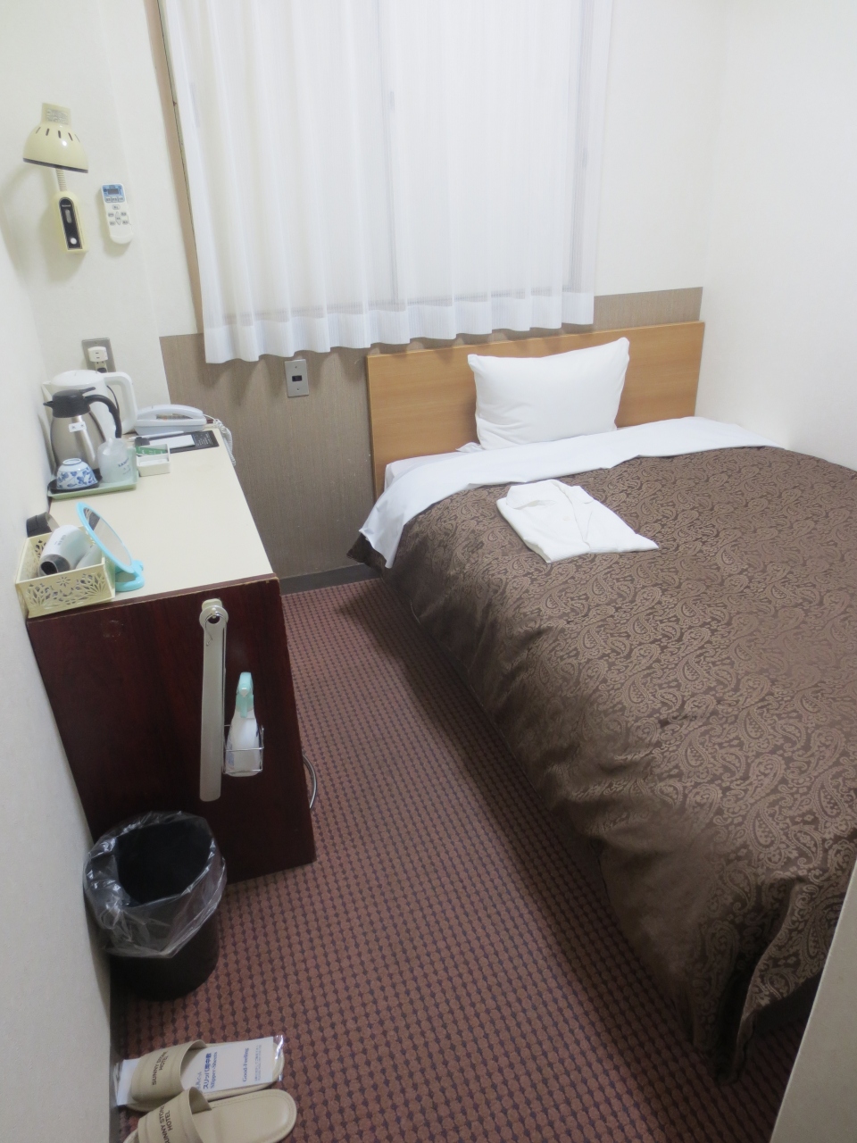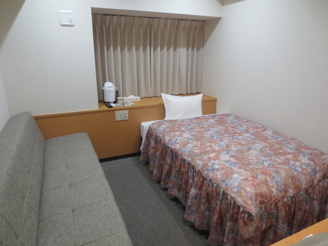 京都駅からは1駅地下鉄利用だったので、厳密には京都駅周辺とはいえないかもしれませんが、8月のトップシーズンに朝夕食が付いて京都でこの値段にはビックリでした。ホテルとはいうものの、まるでワンルームマンション。ソファー付きセミダブルのお部屋をシングルユースしました。これを二人で泊まるのは私にはシンドイかな。