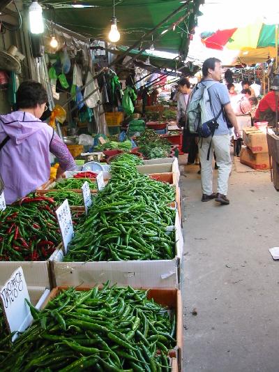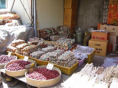 地下鉄で京東市場へいき、市場巡り。焼いた犬や豚の頭、唐辛子など韓国らし...