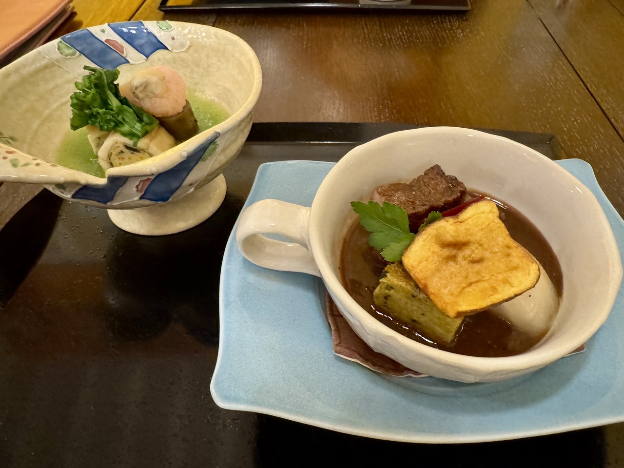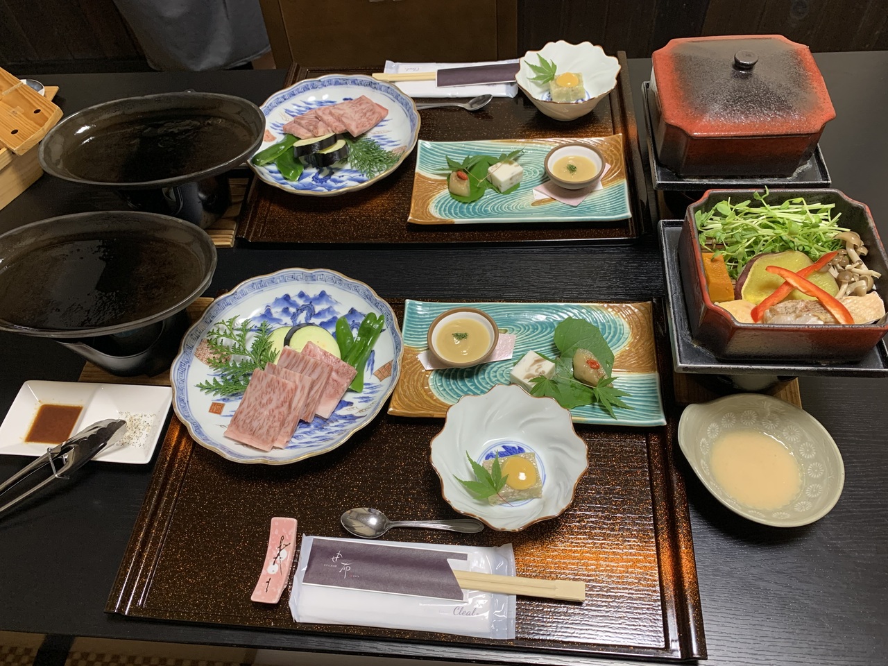 食事は部屋食で和会席、一夜干しの穴子が肉厚で脂も乗っていてとても美味しかった反面、ステーキも出ましたがこれは普通かなという感じでした。
