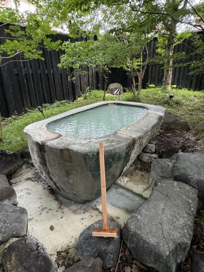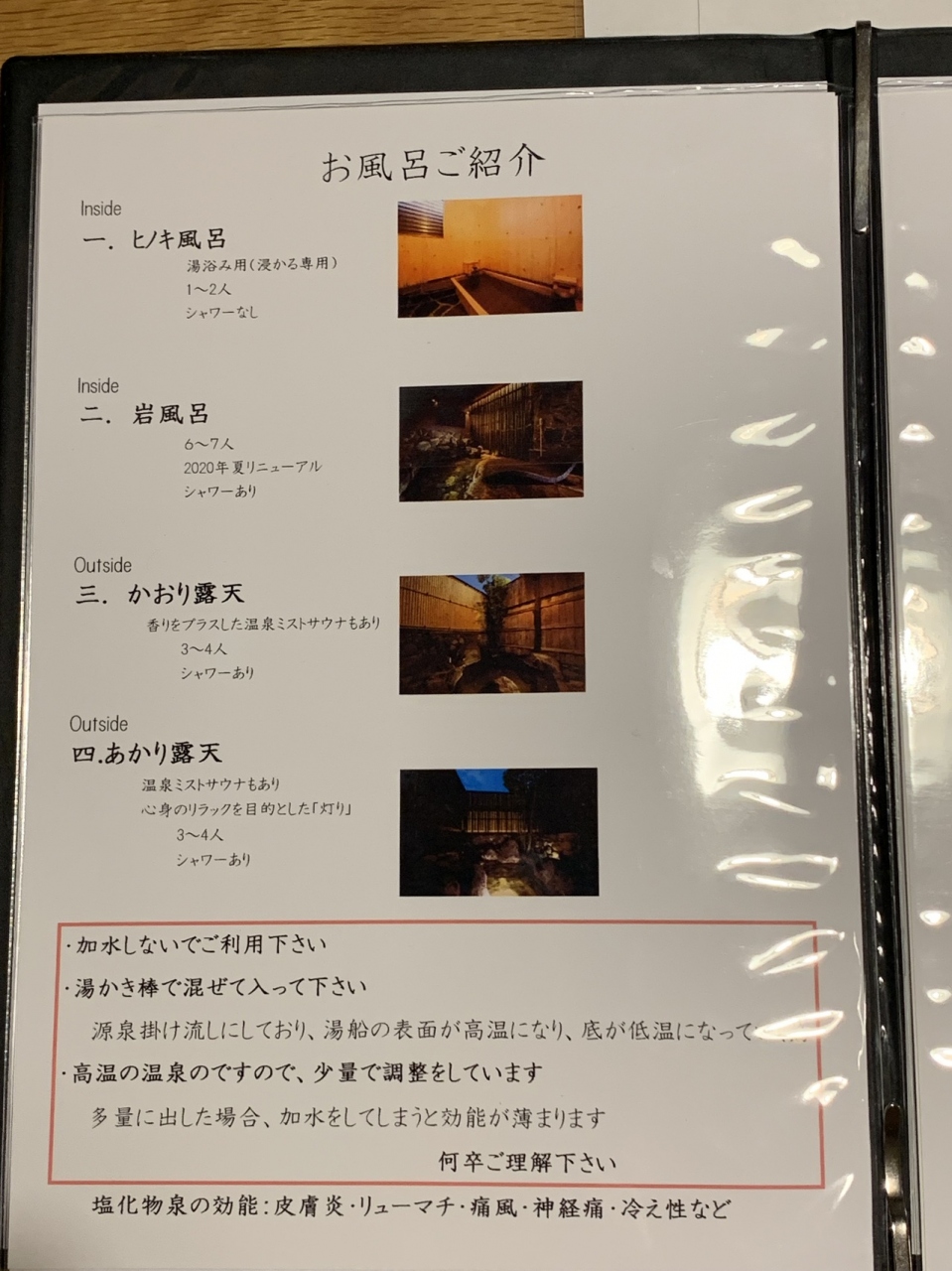 大浴場は無く、4つの貸切風呂があり、空いてる時はいつでも無料で入る事が出来、ミストサウナが付いた風呂も2ヶ所あり、全て源泉掛け流しの温泉となっています。