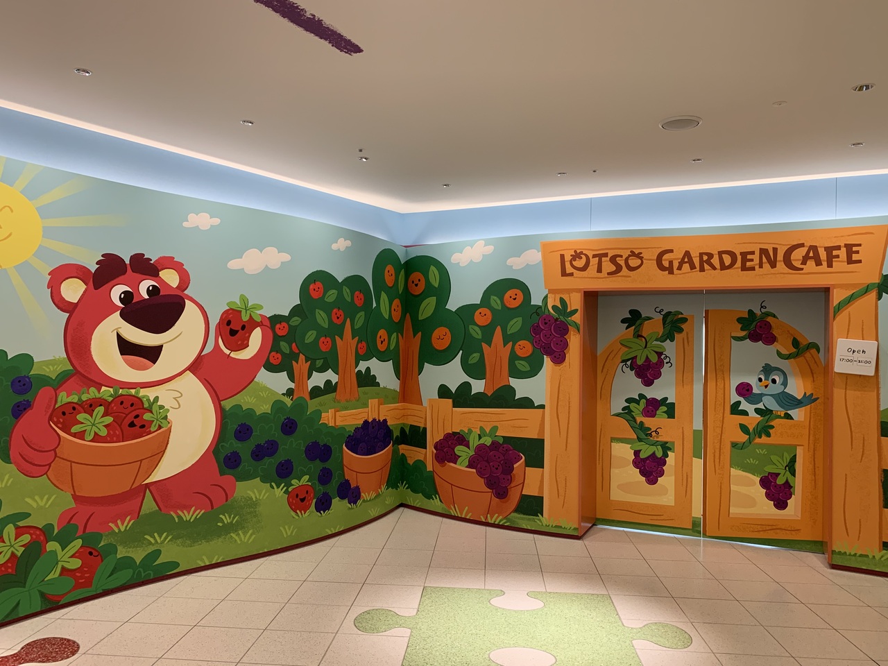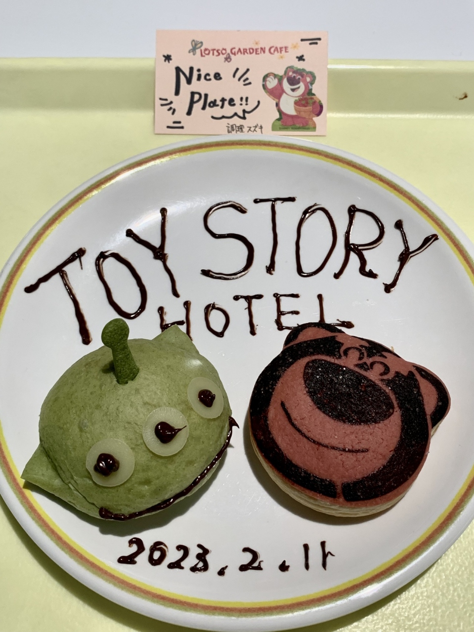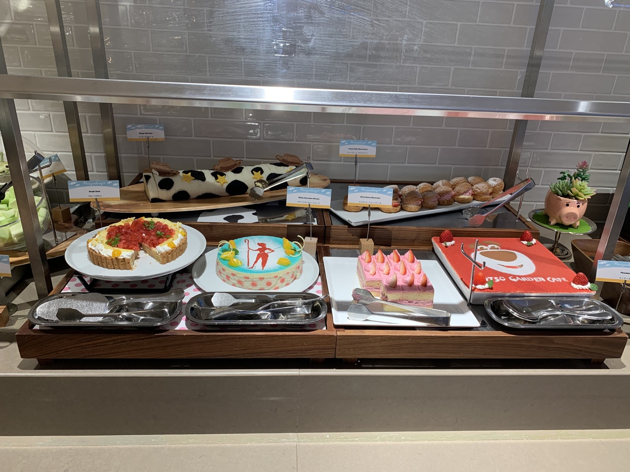 レストランのロッツォ・ガーデンカフェは宿泊者専用のビュッフェスタイルで、キャラが描かれたケーキがあったり、リトルグリーンメンのパンにチョコレートで顔を描くのがとっても面白かったです。