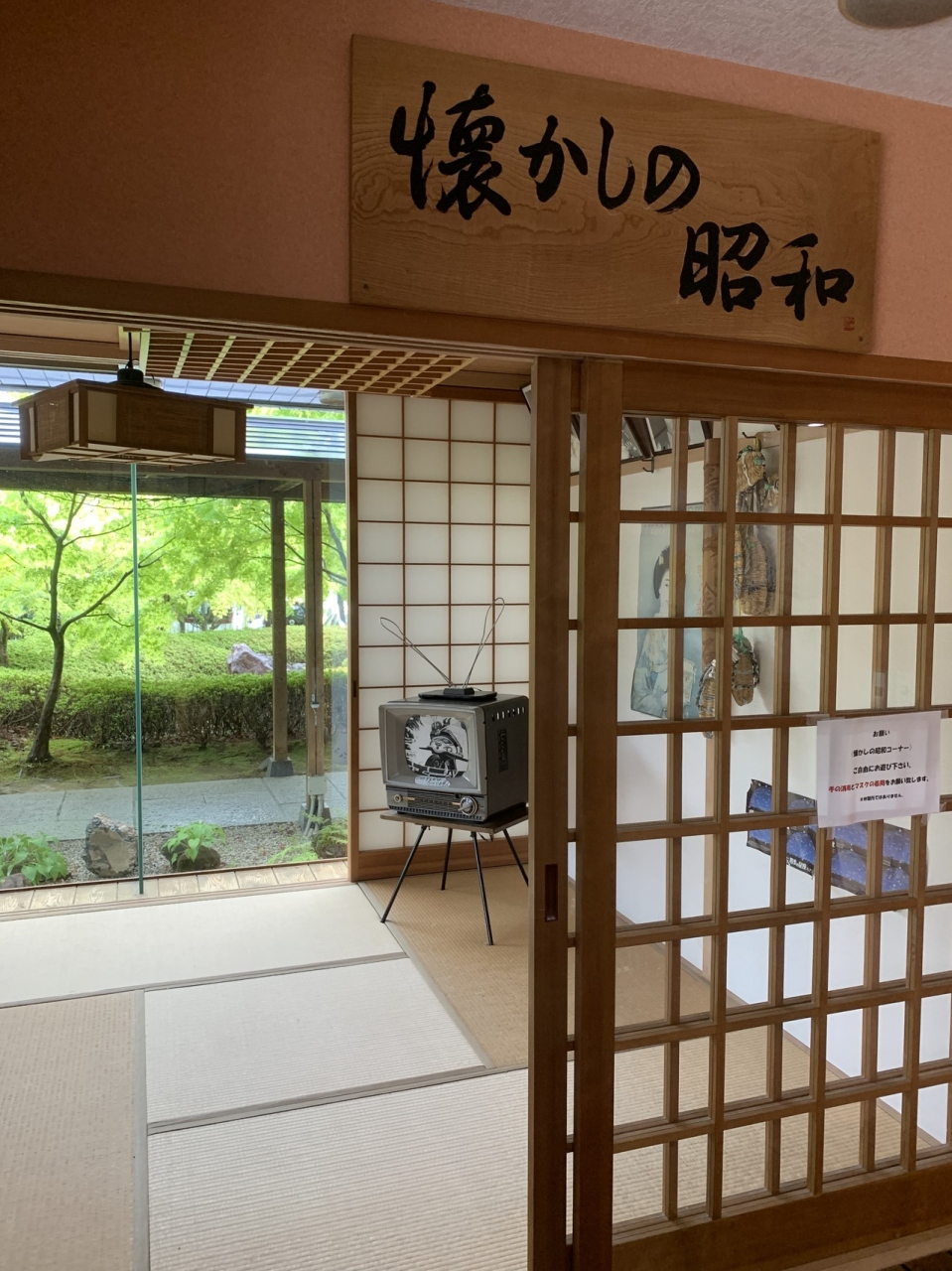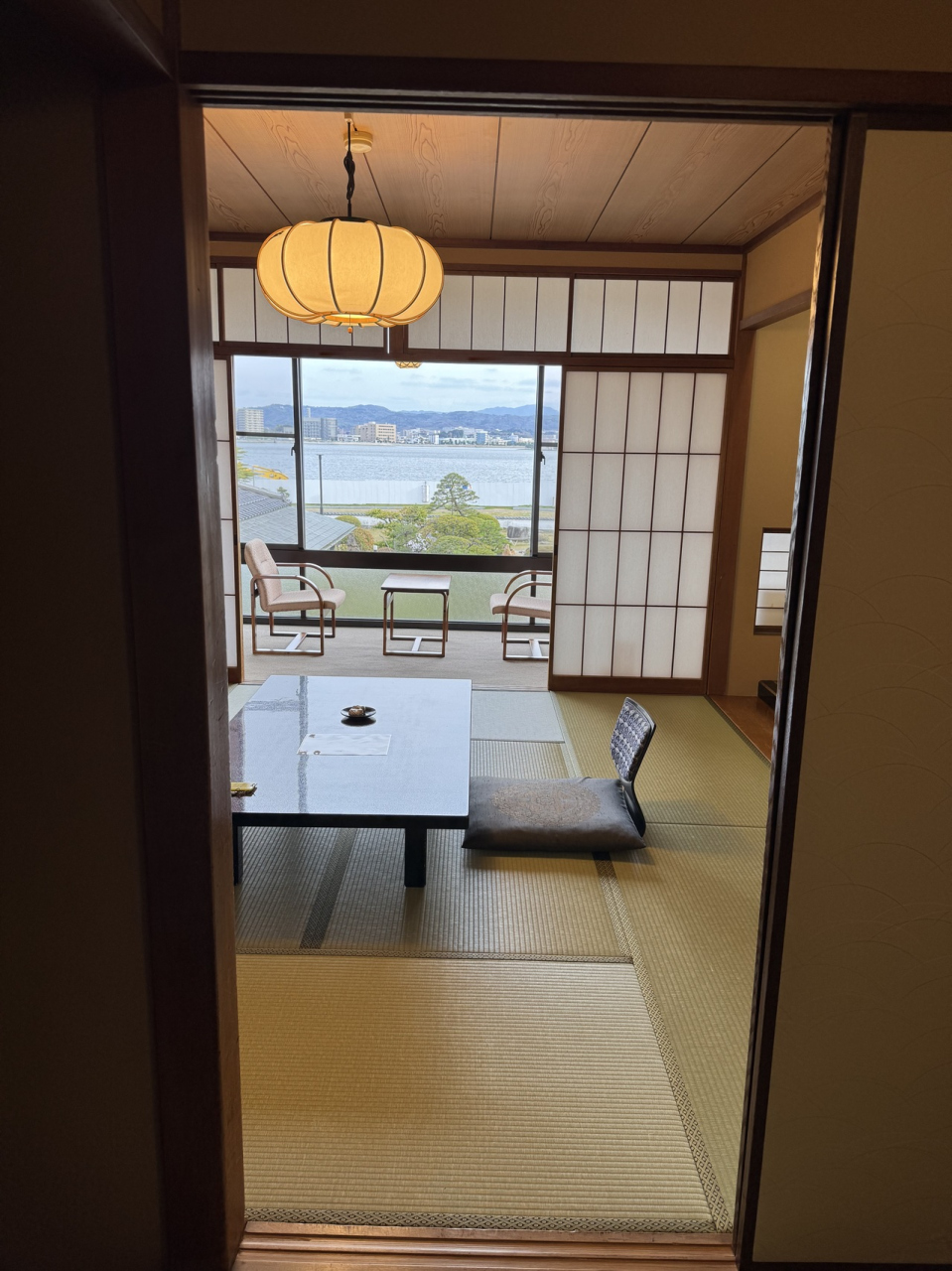 今回の部屋は2階の8畳に板の間付き、トイレはありますが風呂なしで、庭園越しに宍道湖が見えました。