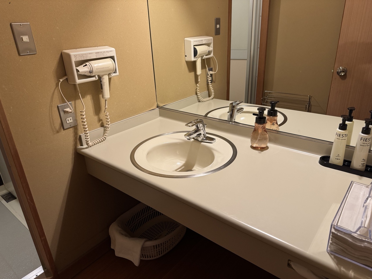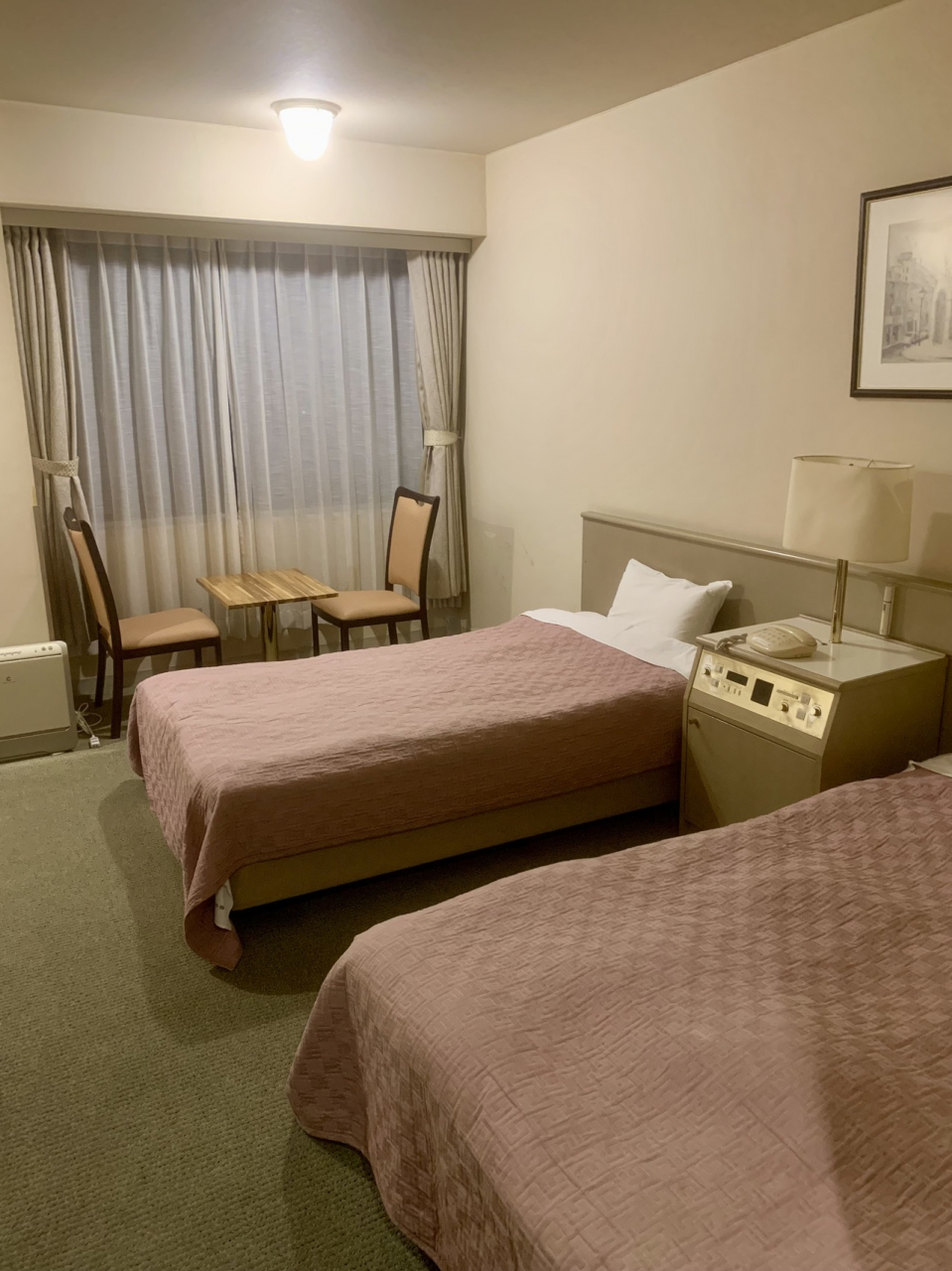 部屋はツインベッドの洋室で、風呂・洗面台・トイレが一緒になったビジネスホテルのような形でした。