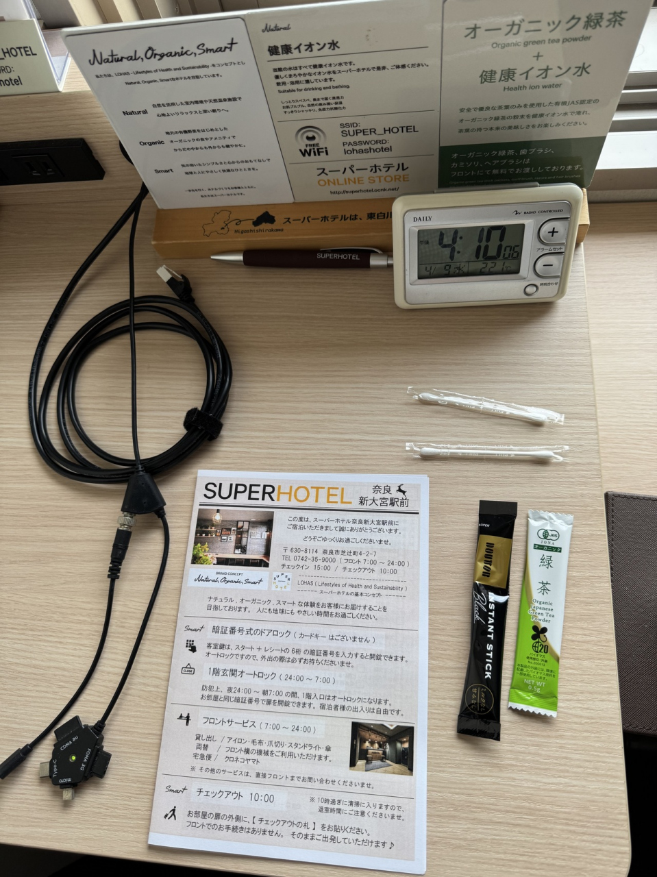部屋には目覚まし時計や充電ケーブルがあり、ロビーにパジャマや歯ブラシ・インスタントのコーヒーとお茶などが置いてあるので自分で持ってきます。