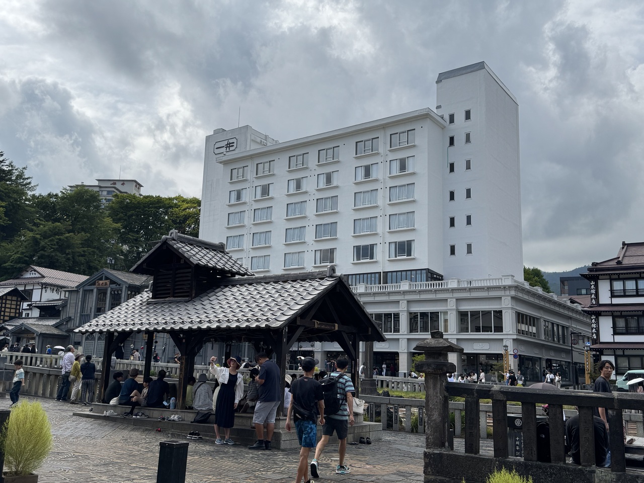 場所は湯畑の目の前で、本館1階の土産物センターが開いてる時間(7時~22時)だと湯畑側から入れます。