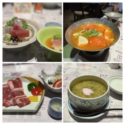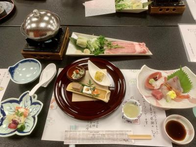 夕食は懐石料理で刺身や豚肉の陶板焼きなどで普通。