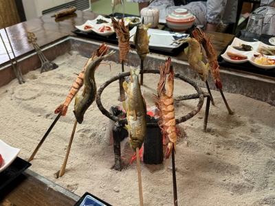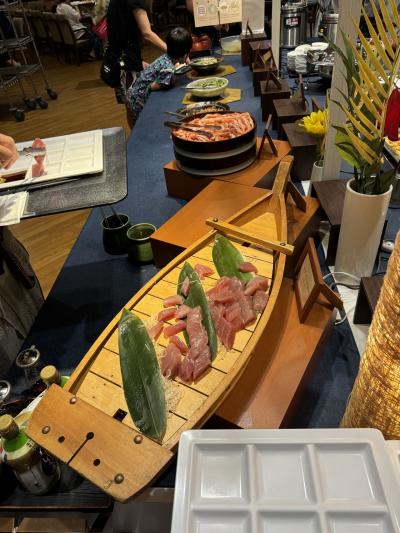 夕食は、舟盛りのメインに大きな太刀魚が使用されこれが絶品で、他に豊後牛のステーキや温泉地獄蒸しなど豊後料理が盛り沢山でした。