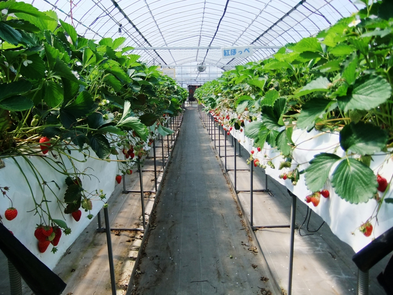 高設栽培をしているので、しゃがんだりせず歩きながらイチゴが取れ、イチゴに土など付いていないので、洗わずそのまま食べられます。