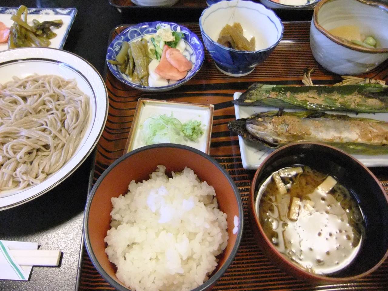 もり蕎麦・岩魚の笹焼き・小鉢が2種類・ご飯・みそ汁・漬物が付き、ボリューム満点でお腹一杯になります。