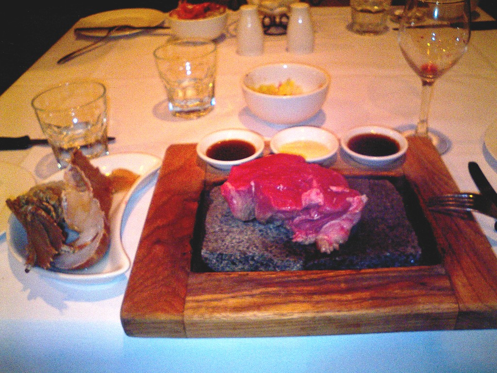 生の肉の塊が熱々の石の上に乗ってきて、自分で好きなように焼けます。