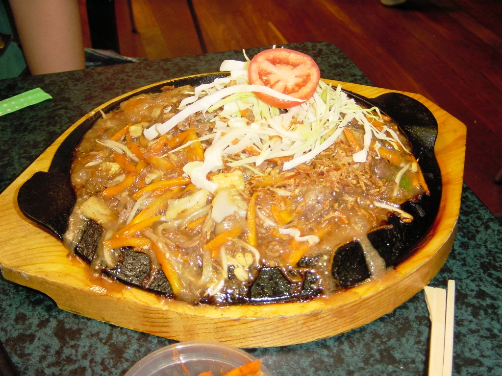 熱した石の器に、ご飯が乗り、その上に韓国春雨・野菜・肉の入ったチャプチェがかけてあり、熱々で何とも言えない美味しさ。