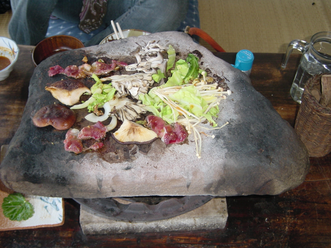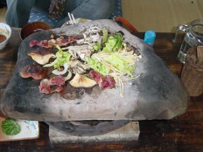 石器の上で、肉・きのこ・野菜がまるで岩盤浴をしているようにジワ~っと焼かれていきます。コースで1890円の木遣坊コース(豚肉・地鶏肉、きのこ類、野菜、ご飯、きのこ汁、漬物)から。3150円の元締コース(猪肉・豚肉・地鶏肉、きのこ類、野菜、前菜、きのこ飯、きのこ汁、漬物)がおすすめです。窓際に座ると、秩父の山並みを見ながらゆったりと食事が出来ます。私たちが行った時は、しいたけの串焼きとアイスもサービスで出してくれました。