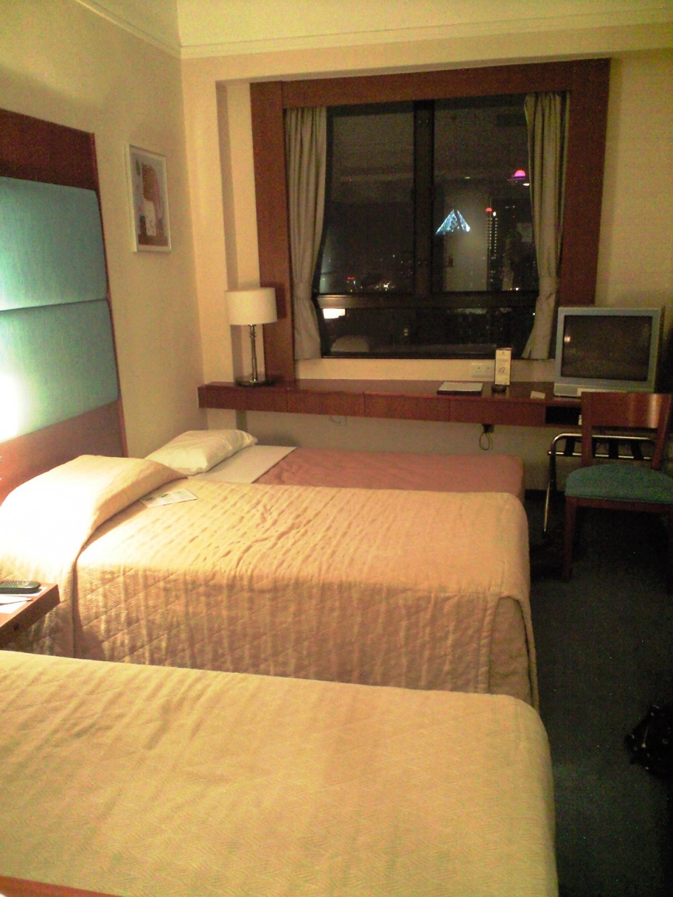 下の階がオフィスになっていて、客室は10階ぐらいから上を使うようで、泊まった部屋は19階で眺めは良く、中は綺麗で清潔感はあり、備品も揃っています。