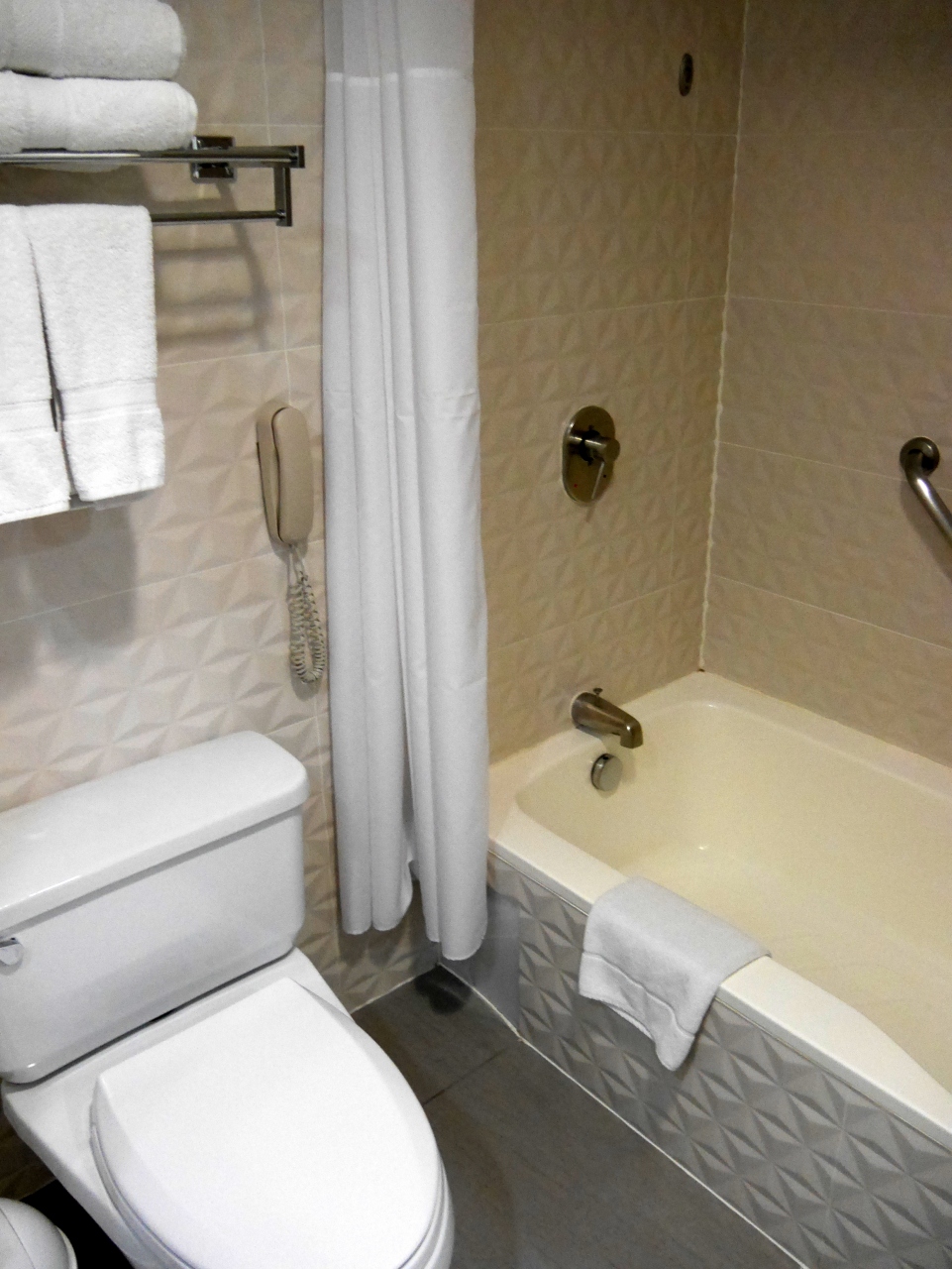 バスタブ、ドライヤー、湯沸かしポット、セイフティボックス、冷蔵庫などがあり、部屋はまずまずの広さです。