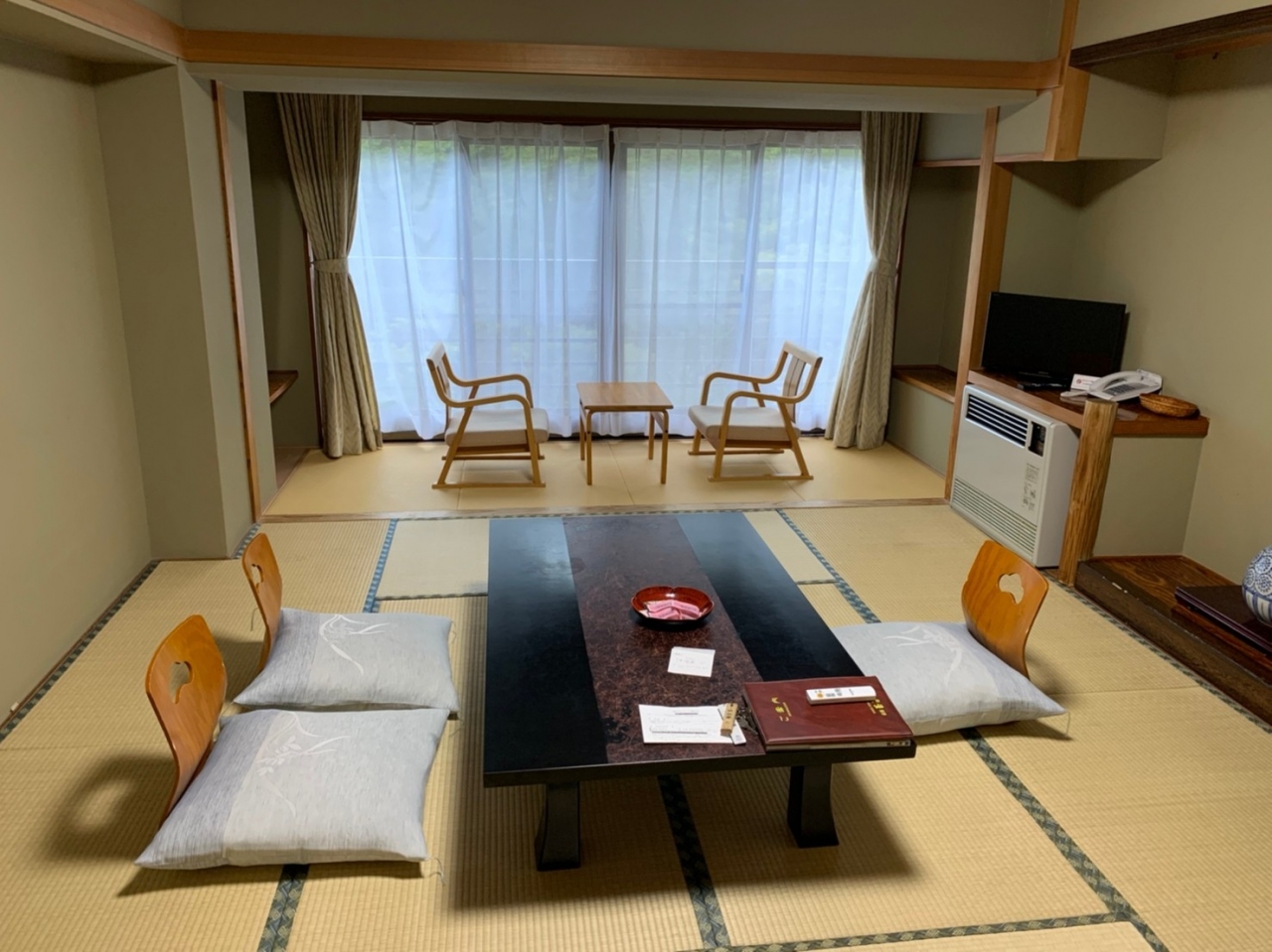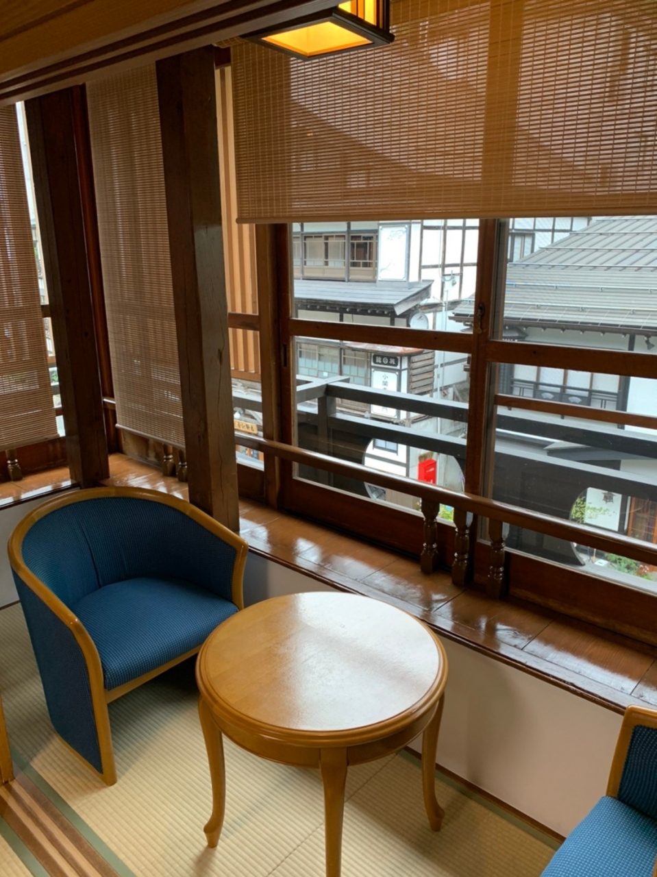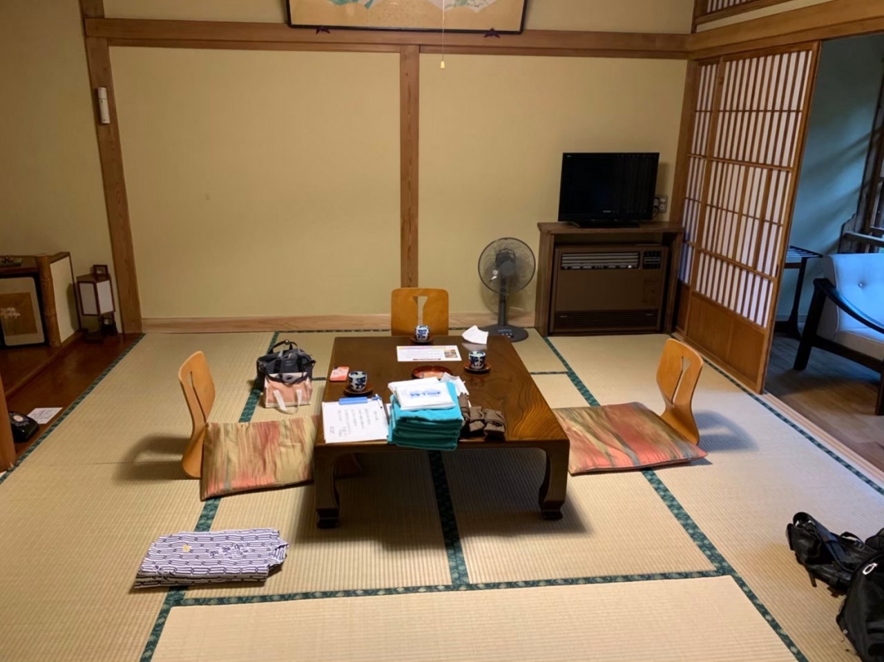 部屋は3階で温泉街が臨める部屋で、8帖の部屋が2つあり、1つの部屋にはベッドが2つ置かれていました。