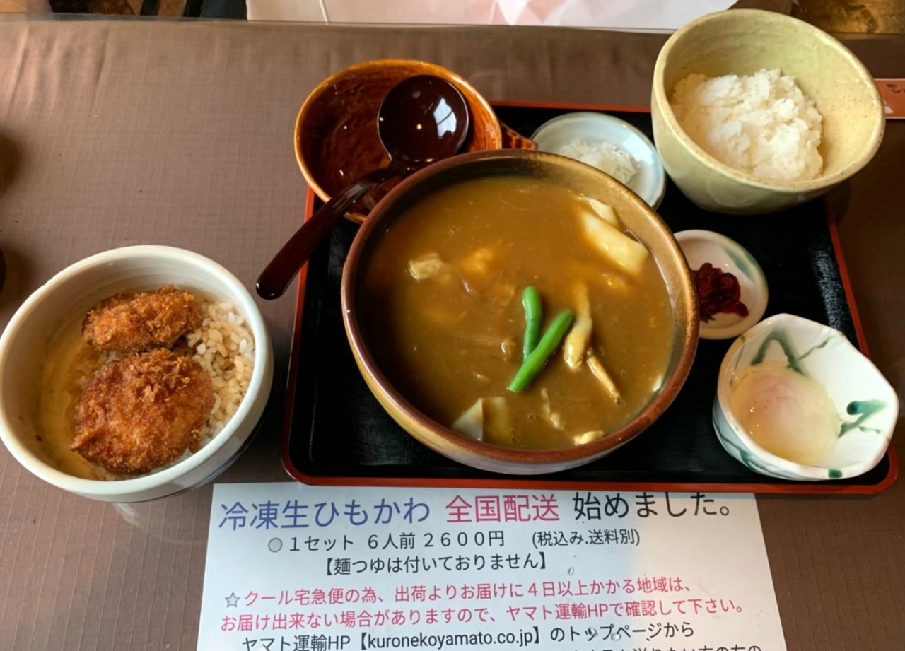 今回注文したのは、カレー南蛮ひもかわセット、肉ナスつけ汁ひもかわ+ミニソースカツ丼、なめ茸おろしひもかわ。