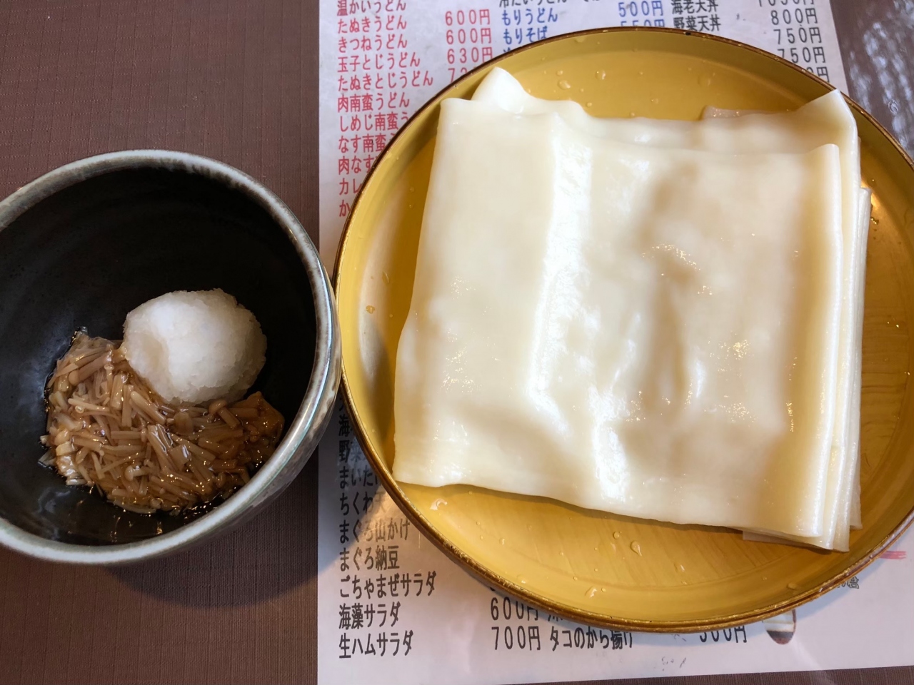 なめ茸おろしひもかわは、冷たいつけ汁なので、ひもかわのしっかりとしたコシも味わえて、これが一番良かったです。