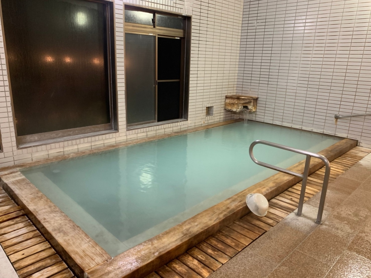 1階に小さな男女別の風呂がありますが、それよりも3階に2つ貸切風呂があり、空いてる時間に自由に入れ、こちらの方がゆったり出来ます。源泉かけ流しでほのかに硫黄の香りがする無色透明なph値は6.6の中性の温泉です。