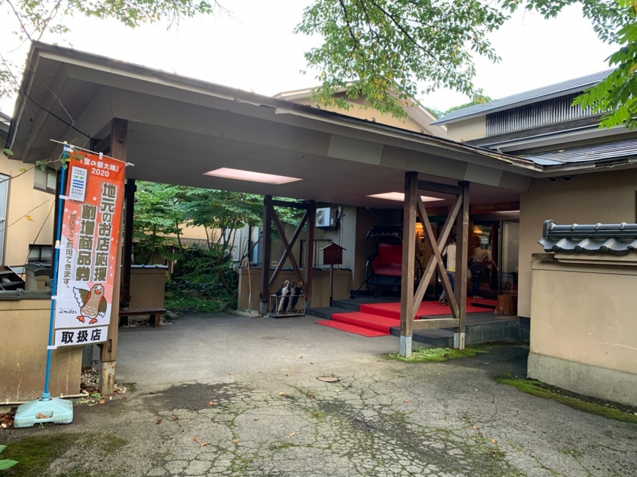 車は温泉街に入れないため、駐車場は少し離れた所にあり、着いたら旅館に電話を掛けると迎えが来て、温泉街の入口まで送迎してくれます。