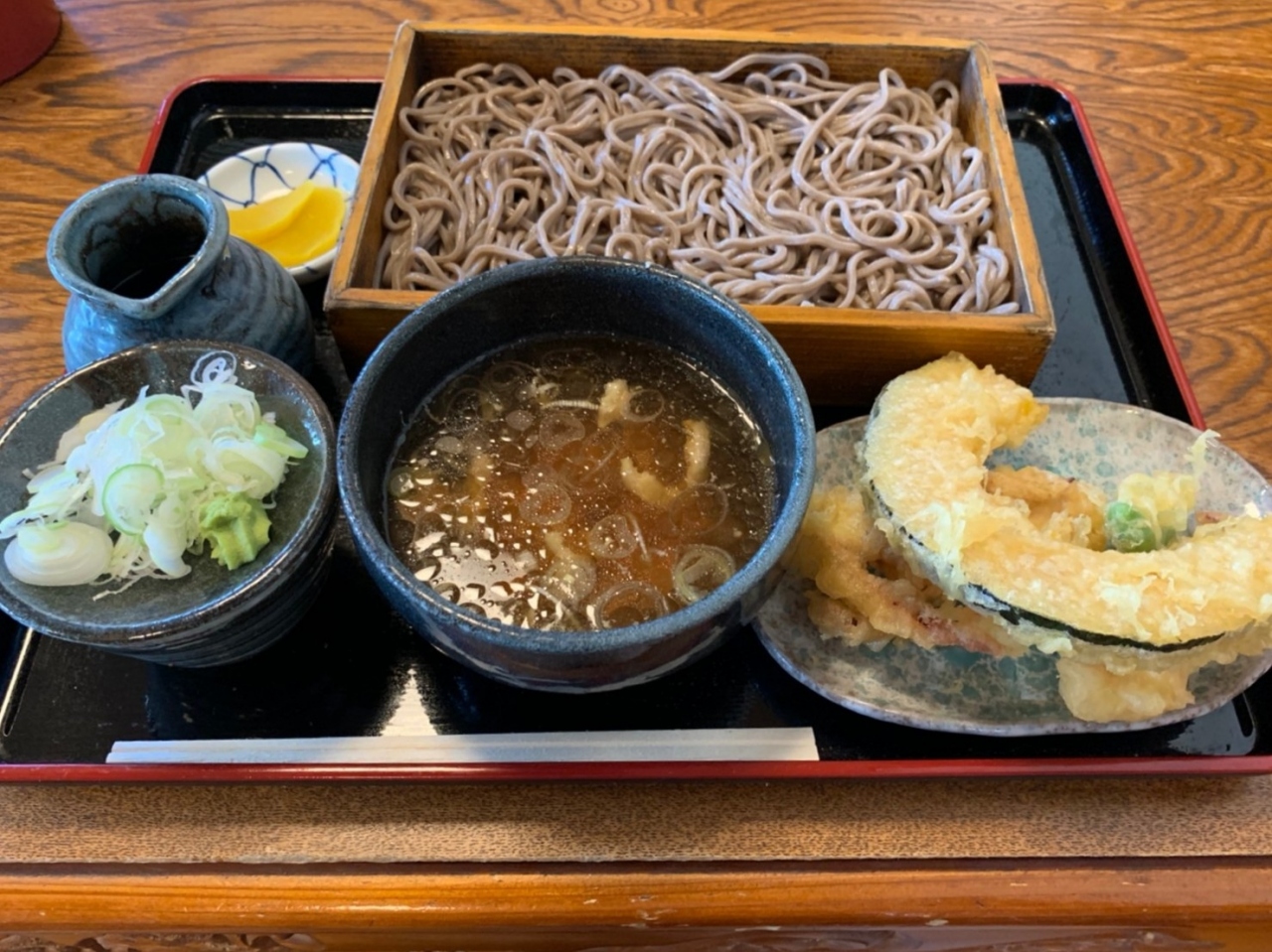 蕎麦は太めで、関東で食べるような喉越しのいい食感ではありませんが、蕎麦の量も多く、お腹一杯になり、税込で830円と言うのはかなりお得でした。- 旅行時期