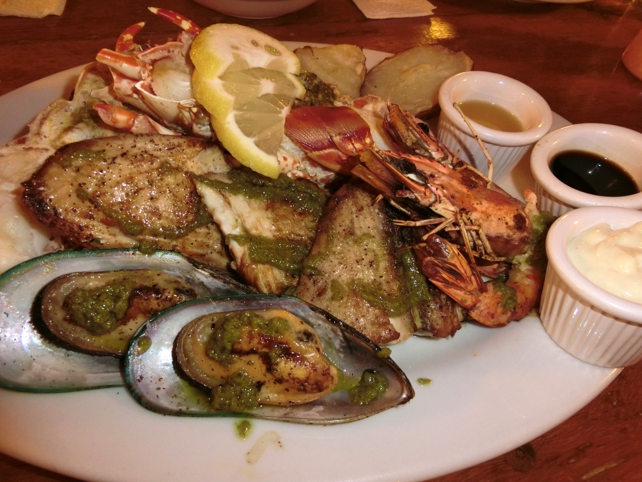 シーフード盛り合わせのプレートには、ロブスター・車エビ・ムール貝・白身魚がのっていて色々と楽しめます。