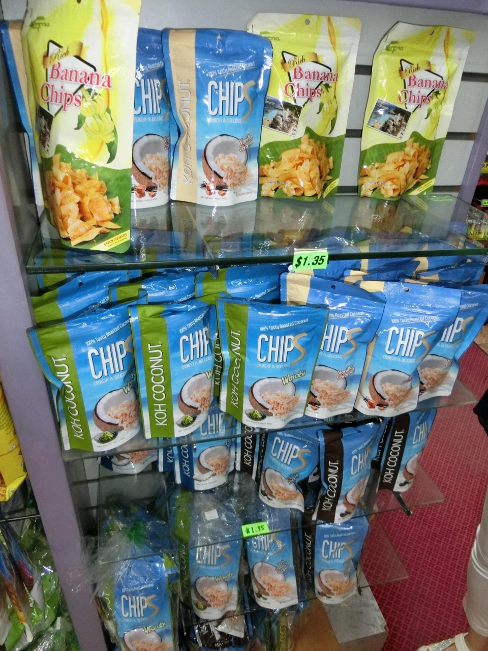 見た目や店の名前からするとちょっと入りにくい感じがありますが、店員の方は日本語も話せ、ココナッツチップ・ドライフルーツやチョコレートなど色々と試食させてくれ、ABCストアやI LOVE SAIPAN などに比べ、種類は少ないもののお土産類の値段は全般的に安かったです。