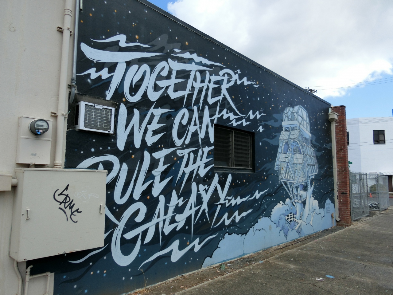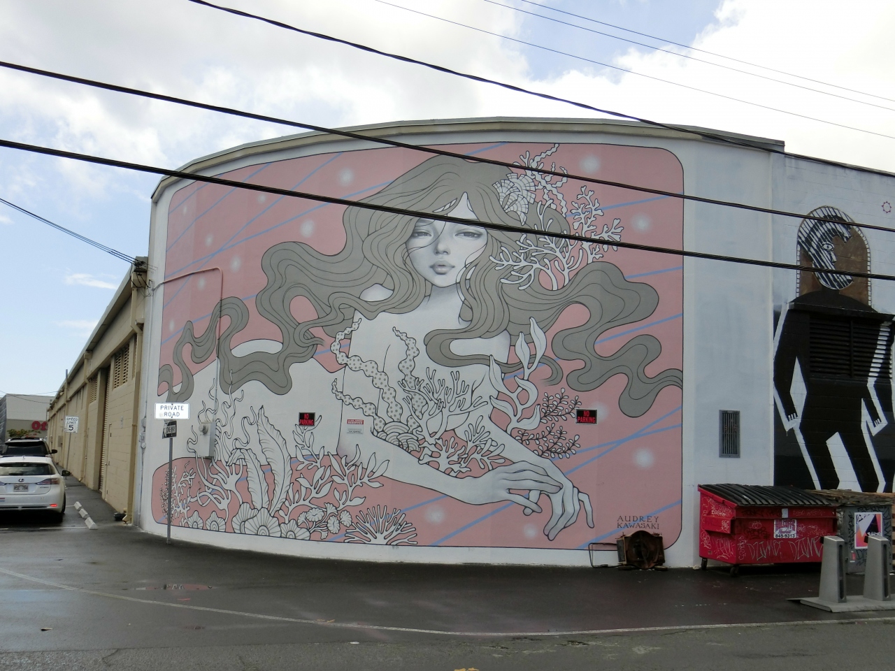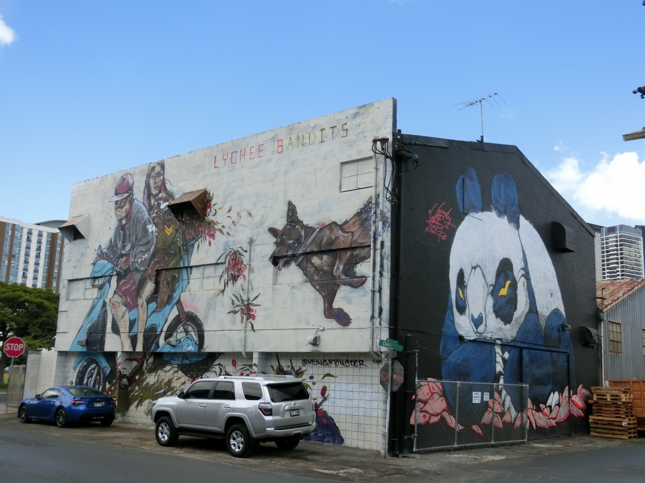 アラモアナショッピングセンターから2~3kmぐらいにある倉庫街で、昔は治安が悪かったそうですが、2011年からウォール・ペインティングのアートイベントが始まり、治安が改善し観光客も多く集まる街になったそうです。