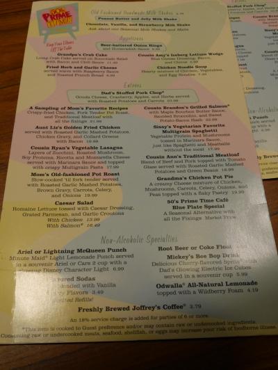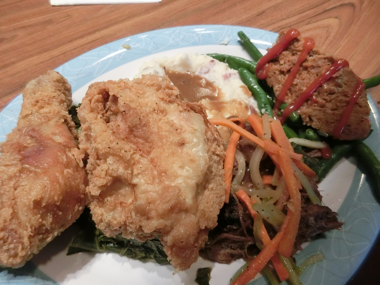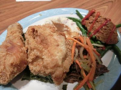 ママのお気に入りというプレートは、フライドチキン・ミートローフ・牛肉にマッシュポテトと数種の温野菜が付いて21.99ドル(税別)。