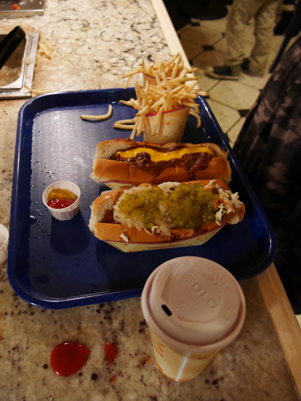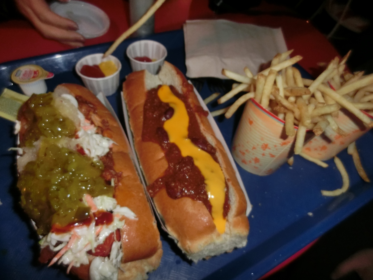 ホットドッグがメインの店で、チリ・チーズドッグ(10.29ドル)とBBQスロードッグ(9.99ドル)を注文。(いずれもフライドポテト付き)