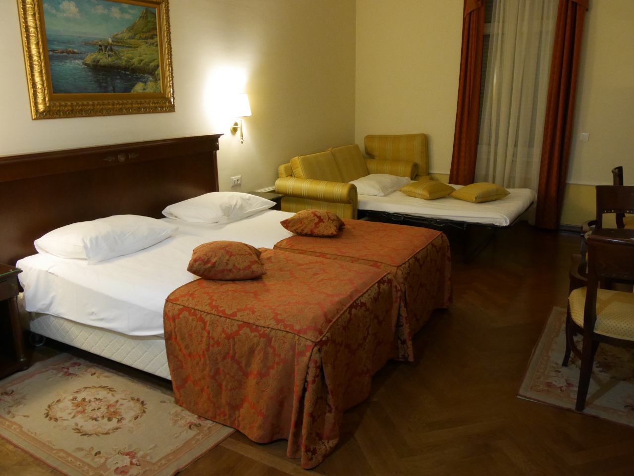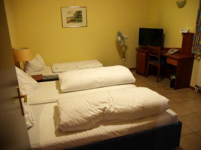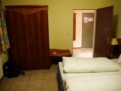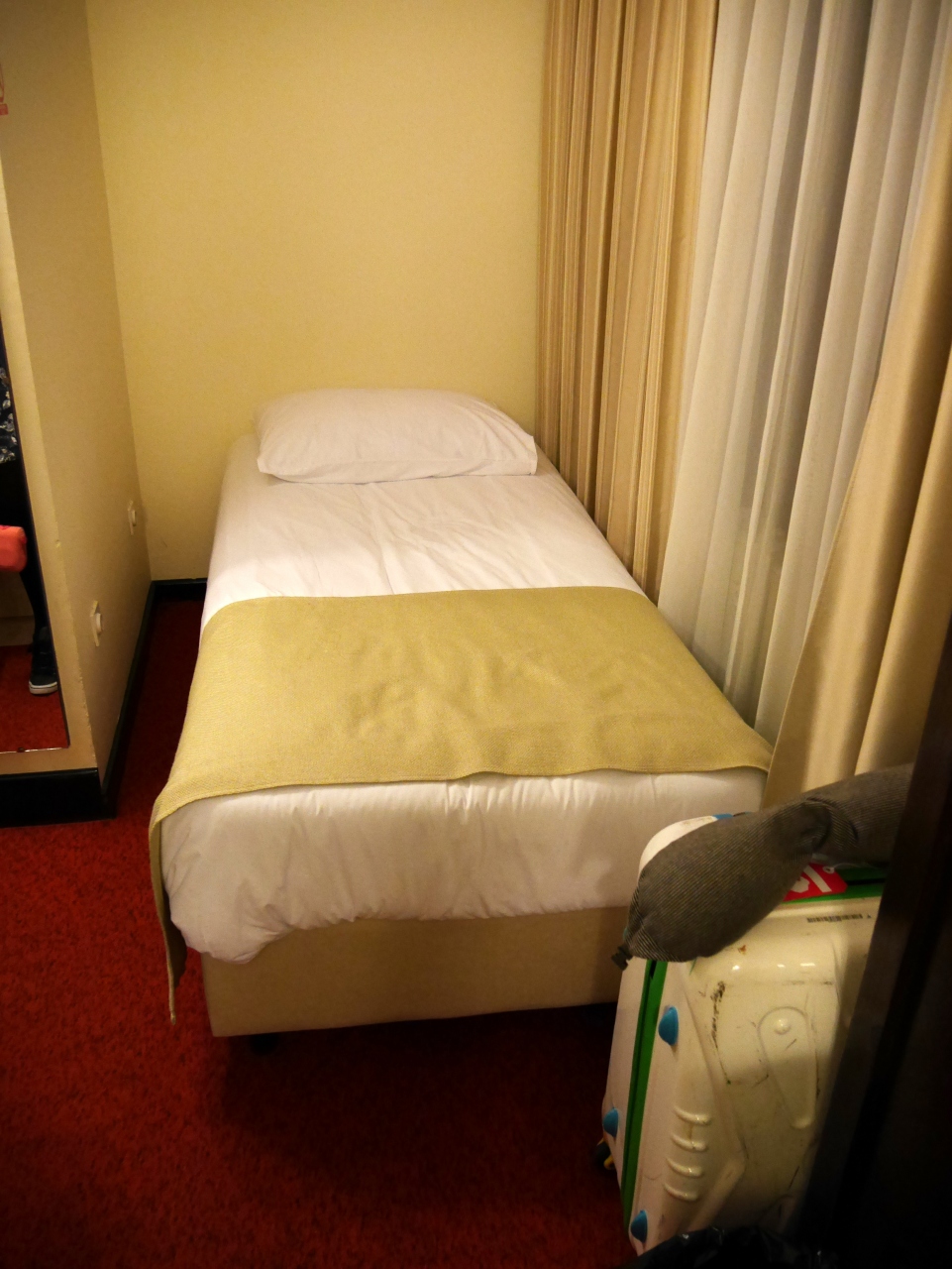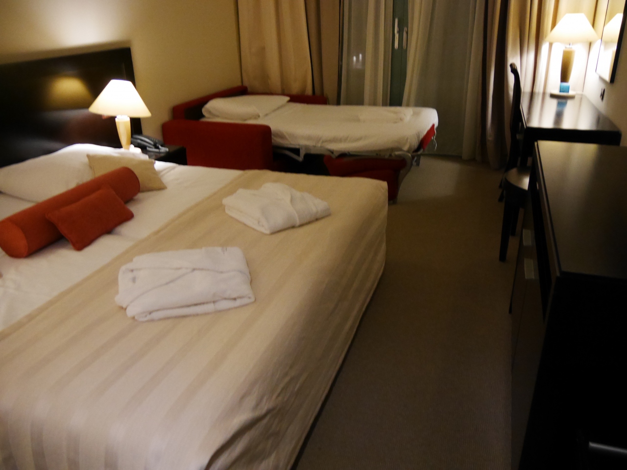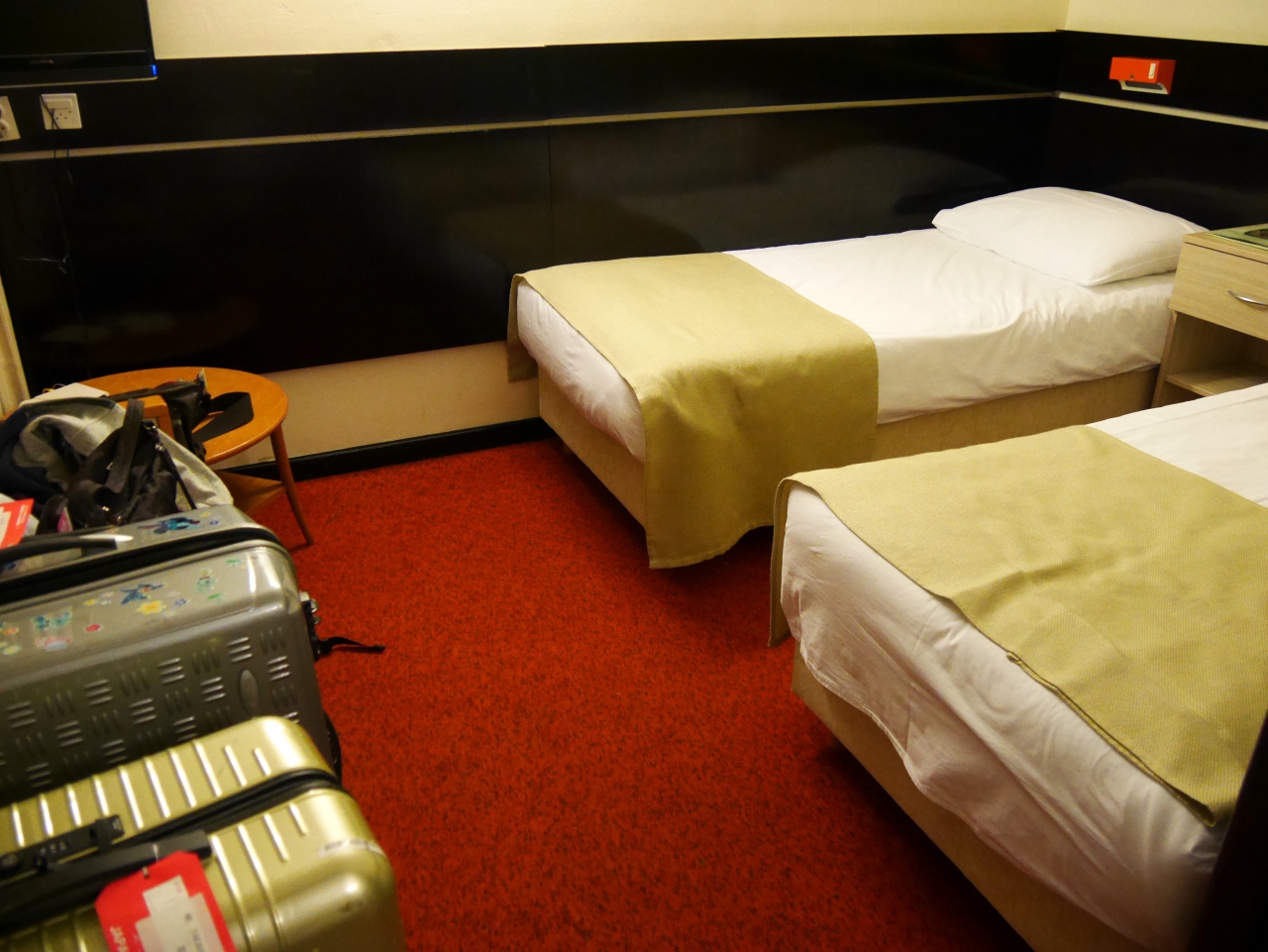 部屋は狭いと覚悟してましたが、ベッド3つを置いてもスーツケース3個が広げられるスペースがありました。