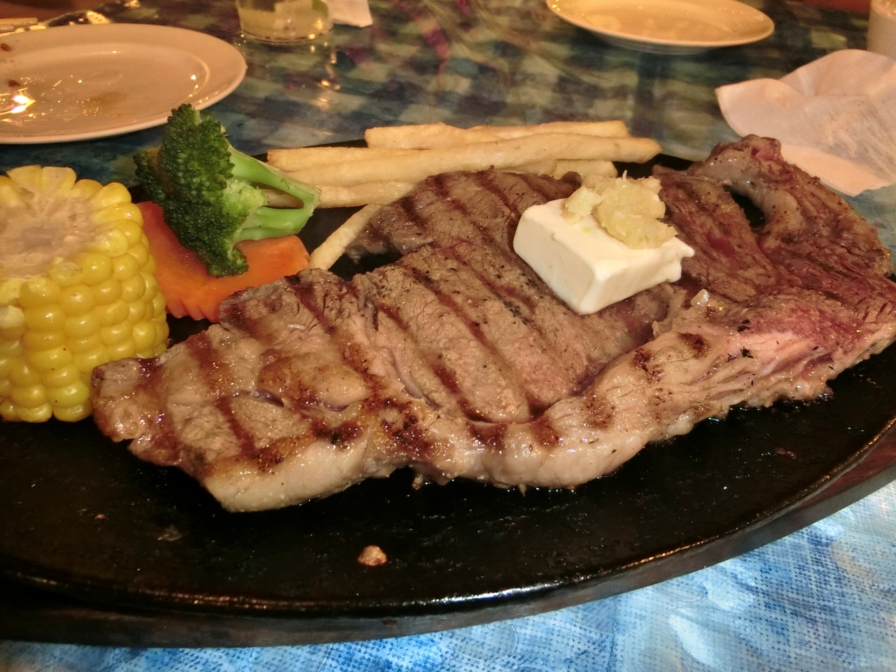 ガーリックステーキ(25ドル)も名物で、肉自体は柔らかくて美味しかったのですが、付いてきたソースを全部かけたら塩辛かったので、少しずつかけながら食べた方がいいと思います。