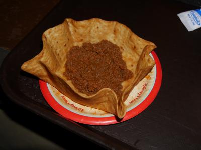 レジでお金を払うと、トルティーヤの器に挽肉が入った物が渡されます。