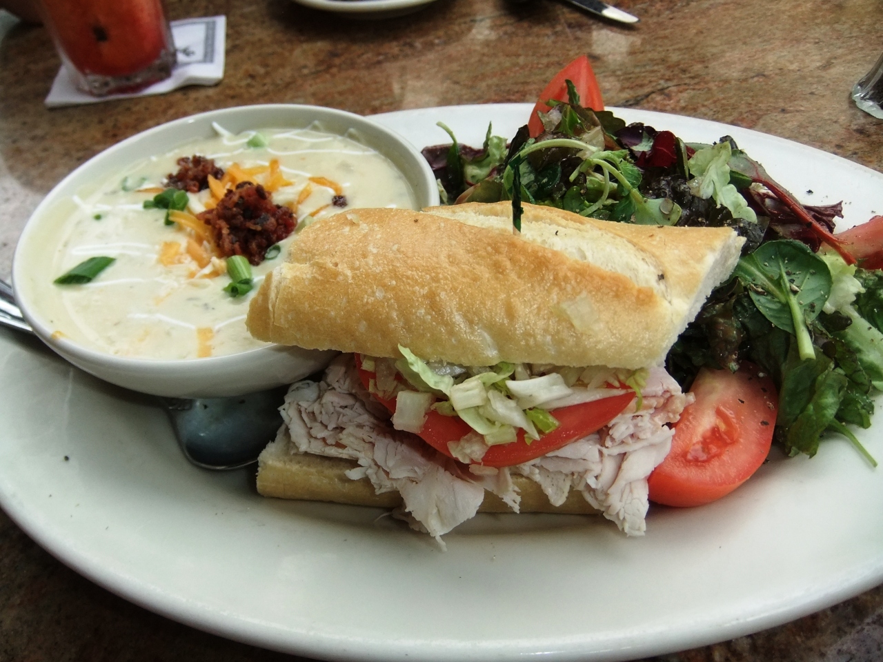 ランチのサンドイッチセットは、バケットにチキン・レタス・トマトなどが入ったサンドイッチ、サラダ、スープがセットになって10.95ドルとお得感がありました。